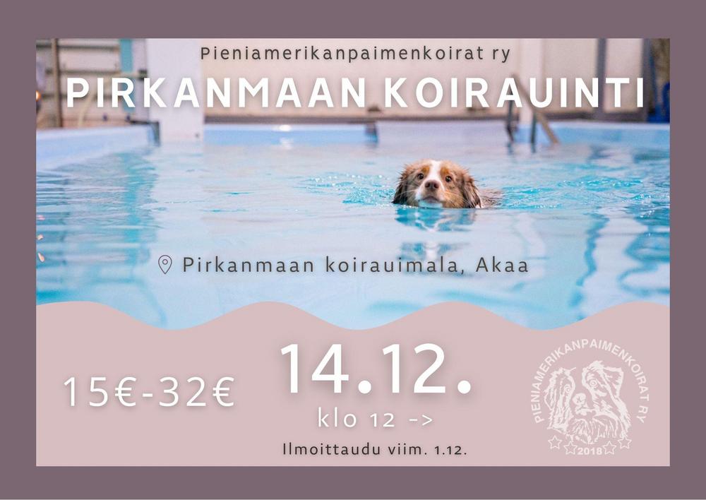 Tervetuloa pampaiden koirauimalapäivään Akaaseen! Uintivuoroille voi ilmoittaa 1-3 koiraa mukaan, uintivuorovaihtoehdon mukaisesti (ks. alla olevat kuvaukset). Voit ilmoittautua yhdessä pampai…