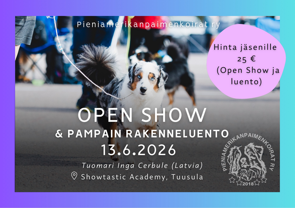 Tervetuloa Pieniamerikanpaimenkoirat ry:n järjestämään ensimmäiseen Open Show -tapahtumaan 13. kesäkuuta 2026 Showtastic Academyn hallille Tuusulaan. Kehä alkaa klo 9.00 ja maksimiosallistujamäärä on…